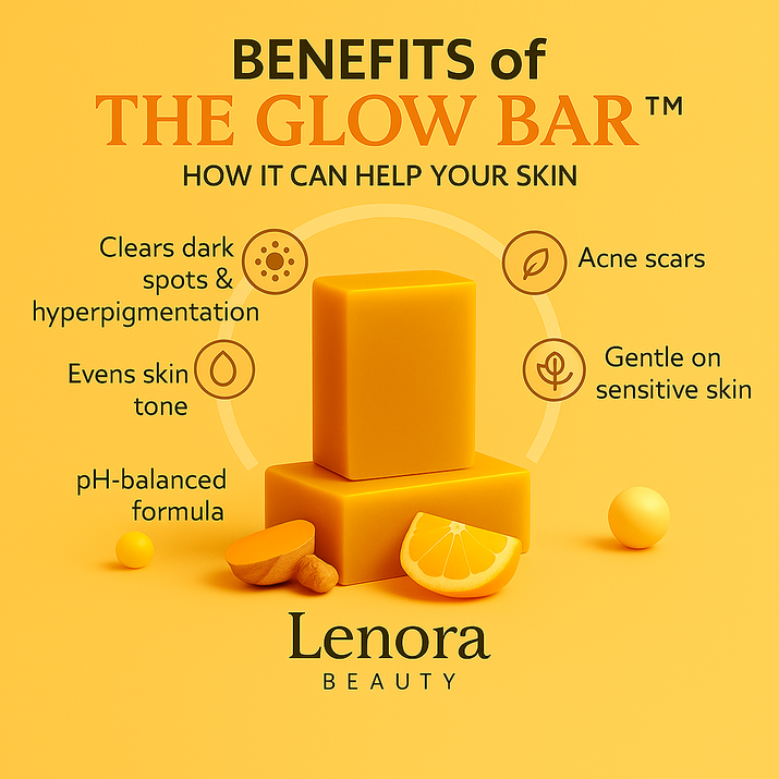 The Glow Bar™ is a brightening soap that combines turmeric root extract, kojic acid, and lemon to address dark spots, acne scars, and uneven skin tone. The formula is pH-balanced to cleanse effectively while protecting the skin barrier.